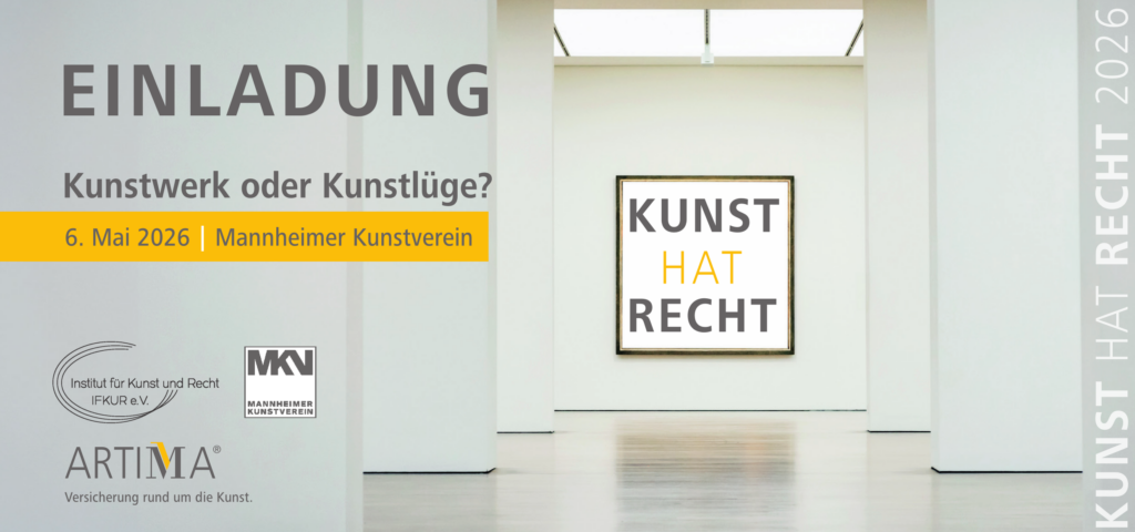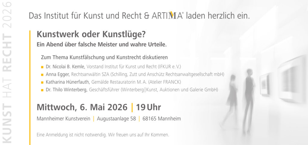 Herr Dr. Nicolai Kemle moderiert am 6. Mai 2026 in der Mannheimer Kunsthalle die Podiumsdiskussion aus der Reihe „Kunst hat Recht“ zu der Problematik der Kunstfälschung. Auf dem Podium sind als Teilnehmer Anna Eger, Rechtsanwältin, Katharina Hünerfauth, Restauratorin, Dr. Thilo Winterberg, Auktionator. Die Veranstaltung findet als Kooperation der ARTIMA, der Kunstversicherung der Mannheimer, der Mannheimer Kunsthalle und dem Institut für Kunst und Recht IFKUR statt.